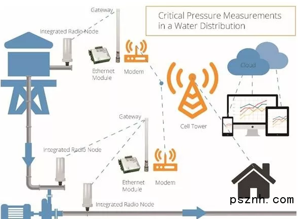 無線遠程監控系統的架構類似于有線系統,通過使用“空中電線”代替電纜來測量水塔的水壓并傳輸到遠程位置。無線遙測系統由眾多終端節點組成,包括為傳感器供電的無線電,該系統可以測量傳輸到網關的壓力。由電池供電,終端節點解決了無電源或電源不穩定的區域使用傳感器的這一難題。