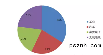 根據IHS統計,2017年全球功率半導體市場的下游應用中,工業應用市場占比為34%,汽車應用市場占比23%,消費電子應用占比為20%,無線通訊應用占比為23%。
