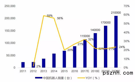 銷量年復合增長超過20%如下圖所示,中國機器人的銷售數量從2013年開始快速增長,年復合增長率超過20%,2018年預測有超過14萬臺的出貨量,按照平均售價20萬計算,工業機器人僅本體市場規模就高達280億。