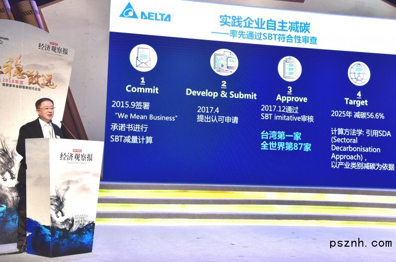 臺達發言人暨企業永續發展部資深協理周志宏代表領獎,并以”綠色企業 永續發展”為題分享臺達經驗。他表示,臺達深信要成為一家永續經營的企業,在追求營收成長的同時,更要重視企業社會責任,才能行穩致遠。臺達積極參與國際倡議減碳活動,扮演世界級企業公民,已連續12年參與聯合國氣候變化大會,今年更在波蘭舉行的COP24期間,邀約國際知名智庫主辦官方周邊會議、參與永續創新論壇(Sustainable Innovation Forum, SIF),和來自全球各地的意見領袖交流,創新科技如何帶來可持續發展。 為積極響應“We Mean Business”企業自主承諾,臺達率先以科學化方法訂定減碳目標(SBT),制定2025年碳密集度下降56.6%的目標,并通過科學基礎目標倡議組織符合性審查,成為中國大陸及臺灣地區第一家、全世界第87家通過審核的企業。