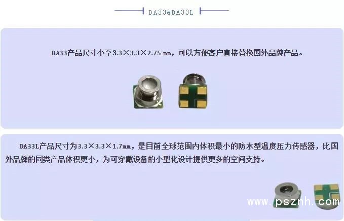 DA33/DA33L的壓力量程為300mbar~1100mbar, 在-20℃到60℃溫度范圍內的壓力精度為±2mbar(可為客戶提供精度為±4mbar的更低成本產品),供電電壓1.8V~5.5V, 數字I2C輸出, 待機功耗低于0.1uA。
