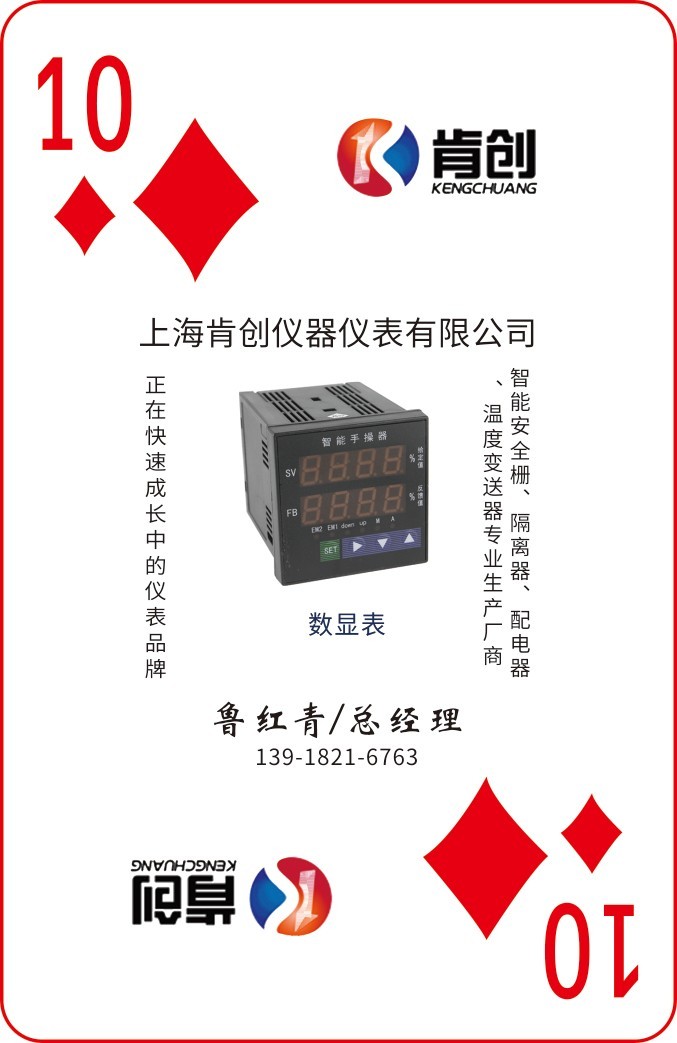 《2020圖頁(yè)儀表行業(yè)撲克牌》推出就得到 上海肯創(chuàng)儀器儀表有限公司總經(jīng)理魯紅青的認(rèn)同和支持,魯總的上海肯創(chuàng)積極認(rèn)領(lǐng)了黑桃10做為此次的公司的專屬牌!