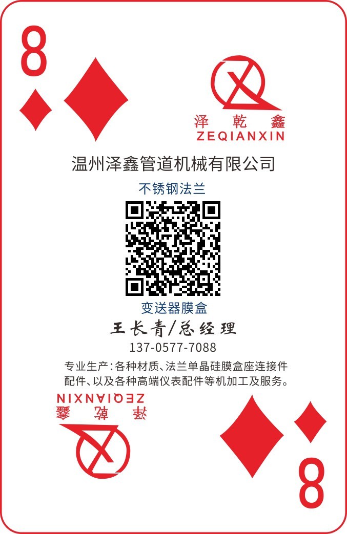 《2020圖頁儀表行業撲克牌》推出就得到溫州澤鑫管道機械有限公司 總經理王長青認同和支持,王總的溫州澤鑫管道積極認領了方塊8做為此次的公司的專屬牌!