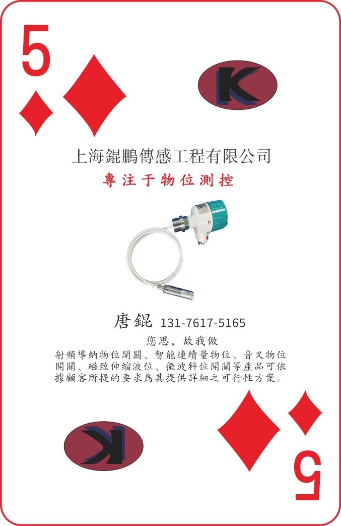 《2020圖頁儀表行業撲克牌》推出就得到上海錕鵬傳感工程有限公司總經理唐錕的認同和支持,唐總的上海錕鵬傳感工程積極認領了方塊5做為此次的公司的專屬牌!