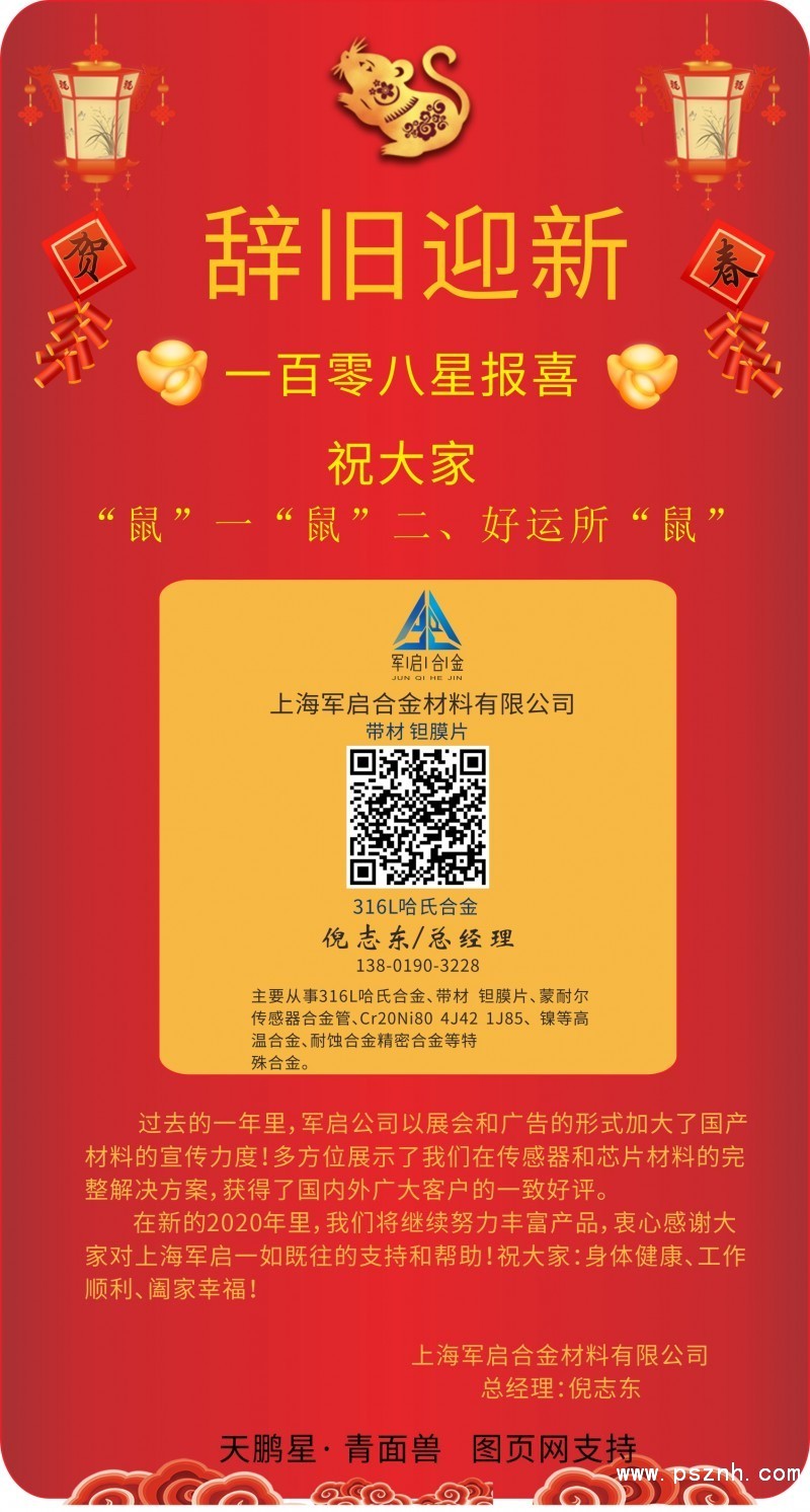在新的2020年里將繼續努力,感謝客戶對上海軍啟合金一如既往的支持和信任,祝新年一年中大家身體健康,工作順利,闔家幸福!