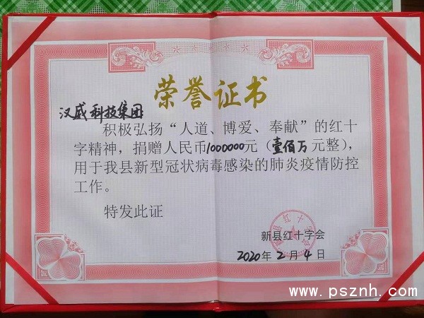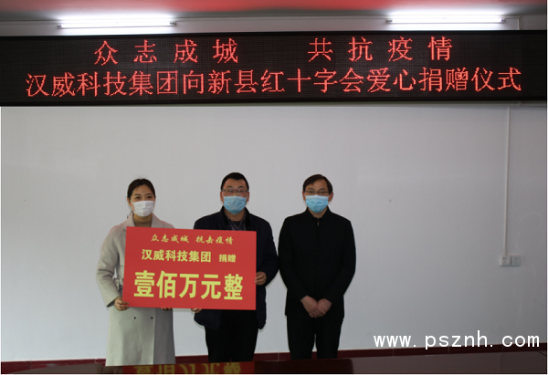 2月3日,漢威科技集團股份有限公司向信陽新縣紅十字會捐贈資金100萬元,專項用于該地區(qū)購買新型冠狀病毒肺炎急需的醫(yī)療物資及滿足該地區(qū)部分緊急現(xiàn)金需求,為保護革命老區(qū)人民群眾生命安全健康、為堅決打贏疫情防控阻擊戰(zhàn)貢獻綿薄之力。