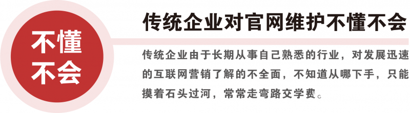 企業官網是企業形象的窗口,很多人來了發現您的窗口是關閉的,或是展示是農耕時代過時的東西,會對企業好感值下降到零!永遠沒辦法實現您打造品牌塑造的訴求。 如果企業的官網始終停流在建網初期,而且老總連自己的后臺進入方式也找不到!辛苦建設平臺成了一個死網站,不但起不到推廣宣傳的作用,反而降低影響公司形象!由內及外,如果內在得不到革新和維護最多是宣傳也是緣木求魚。企業官網維護好推廣就是事半功倍,相輔相成!說明了不論多少推廣,最終是通過企業網站這窗口,讓用戶看到企業的實力和發展步伐,讓自己的品牌升值!
