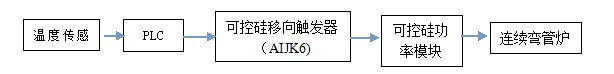 溫度傳感器測出連續彎管爐內的實時溫度后給PLC,與PLC的設定值比較后輸出一個4-20mA的電流信號給可控硅移向觸發器,可控硅移向觸發器輸出觸發信號給可控硅功率模塊從而精確控制連續彎管爐內的溫度。