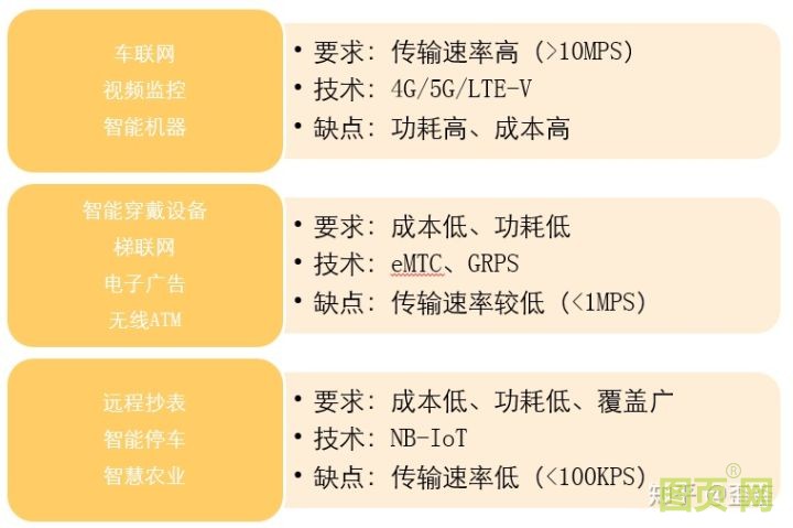 ——NB-IOT:構(gòu)建于蜂窩通信的窄帶物聯(lián)網(wǎng),只消耗大約180KHZ的帶寬,可直接部署于GAM網(wǎng)絡(luò)、UMTS網(wǎng)絡(luò)、LTE網(wǎng)絡(luò)以降低部署成本,實(shí)現(xiàn)平滑升級(jí)。聚焦于低功耗廣域網(wǎng)市場(chǎng),覆蓋廣、連接多、速率低、成本低、功耗低、價(jià)格優(yōu)的特點(diǎn),可用于遠(yuǎn)程抄表、資產(chǎn)追蹤、只能停車、智慧農(nóng)業(yè)等。