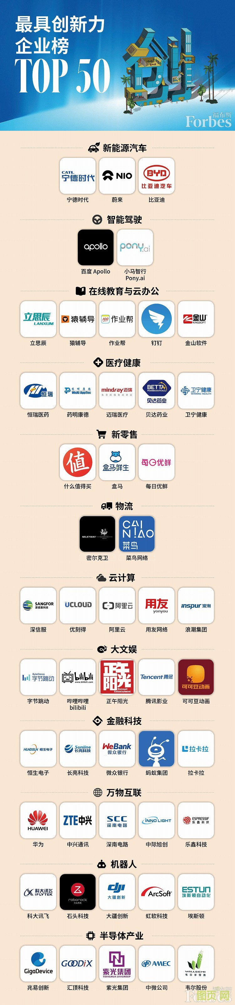 2020年6月22日,中國福布斯發(fā)布“2020中國最具創(chuàng)新能力企業(yè)榜”,排行榜涵蓋12個行業(yè)的50家創(chuàng)新企業(yè)。