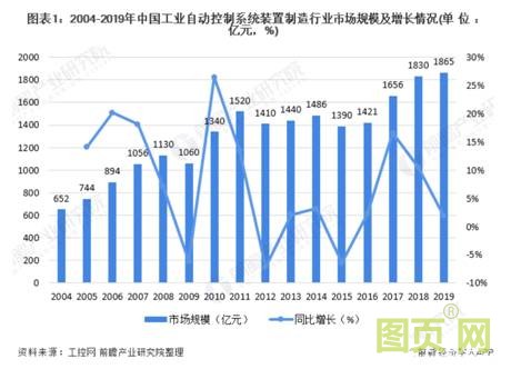 2019 年工業自動化行業整體需求較為疲軟,由于中美貿易爭端帶來的不確定性,全年制造業固定資產投資增速維持在2-3%的低位。19 年OEM 和項目型市場需求的分化,在單產品的市場規模上也有所反映,19 年國內低壓變頻器市場規模為203 億元,同比微增0.43%,而伺服和PLC 產品的市場規模分別為110/113 億元,同比分別下滑5.6%/2%。總體而言工業自動化市場規模已經從2004年的652億元增長至2018年的1830億元,年復合增長率達到7.65%;2019年我國自動化及工業控制市場規模達到1865億元,規模增速繼續下滑。