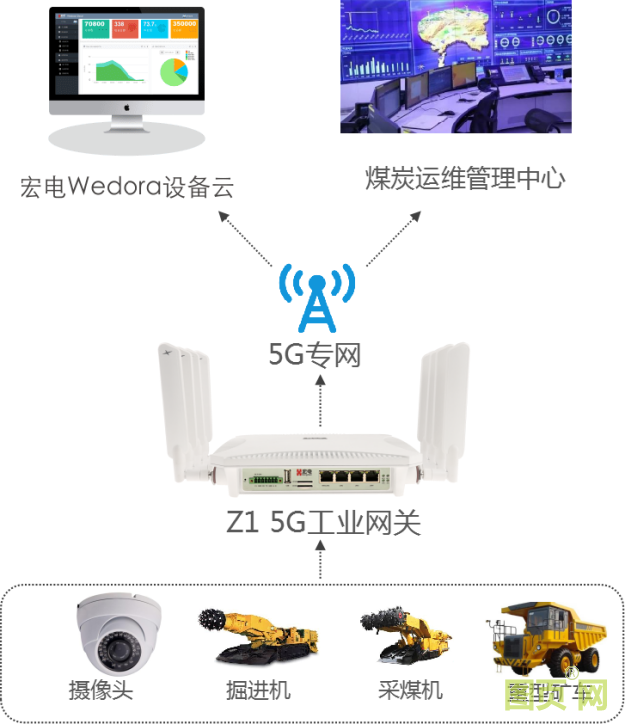 l針對井下場景,接入宏電5G工業網關,通過網關提供5G專網部署,實時傳輸井下采掘設備、通風、運輸等數據到運維中心,從而實現井下生產環境實時監測、井下自動化設備和信息化數據實時回傳、改善井下工人通信條件,保障數據安全可靠回傳;