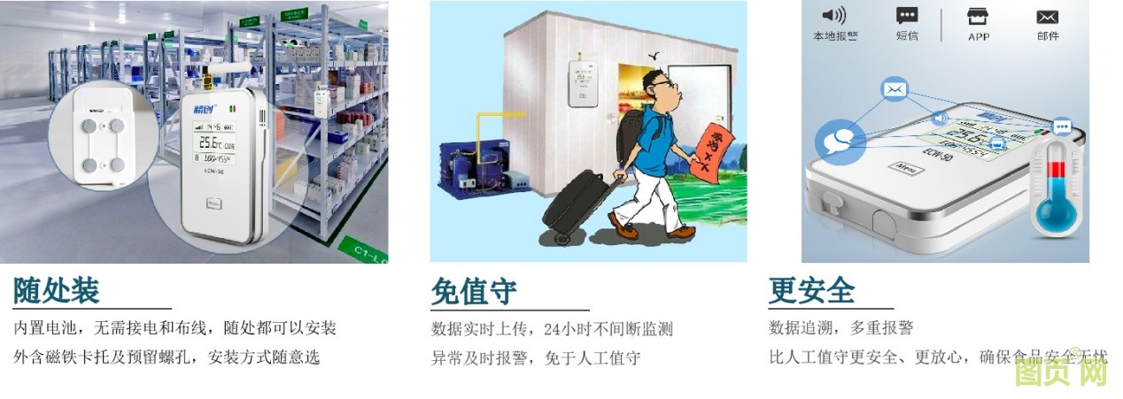 應用物聯網技術,精創電控系統可實現對制冷系統的實時監測和數據分析,加上多重報警方式(微信,短信,郵件,外接燈光警鈴等),保證了整體冷庫系統的安全、可靠、高效運行,從而保證儲藏食品的安全。
