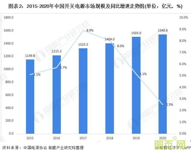 根據中國電源協會數據,2019年開關電源市場規模為1503.0億元,同比增長5.1%。ReportWatch研究指出,中國開關電源行業未來五年復合增長率約為2.5%,結合2020年全球疫情對開關電源行業的影響及開關電源行業下游領域增速放緩的趨勢,預計2020年開關電源行業市場規模為1540.6億元。