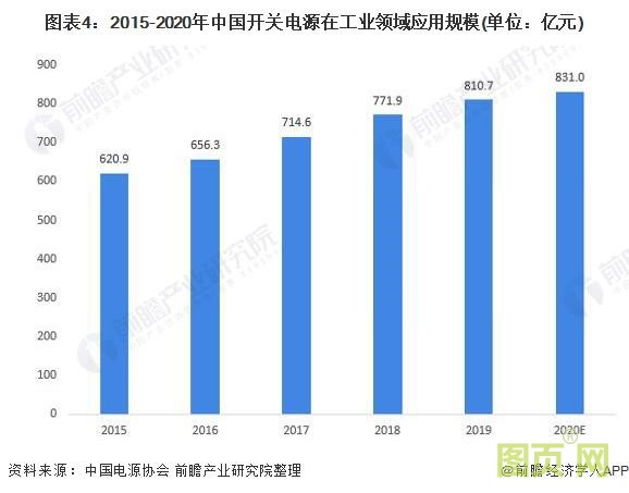 根據中國電源協會的數據,2019年我國開關電源行業市場規模為1503.0億元,而工業領域在開關電源的下游應用中占比為53.94%,因而2019年開關電源在工業領域應用規模為810.7億元。