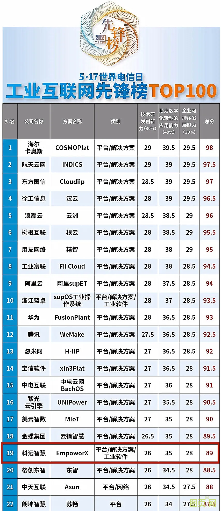 經工信部《通信產業報》全媒體與《工業互聯網世界》權威公正的審核,科遠智慧EmpoworX工業互聯網平臺從眾多參選企業中脫穎而出,排名19。