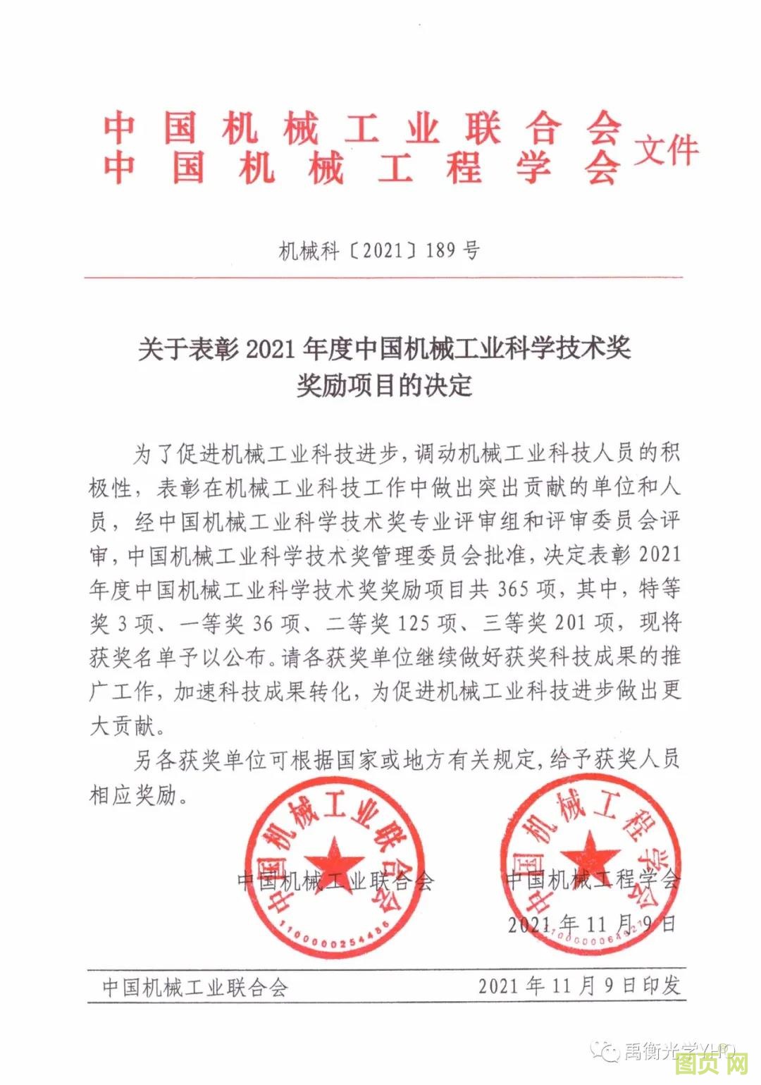 中國機械工業科學技術獎是由中國機械工業聯合會和中國機械工程學會共同設立,經國家科學技術部批準,國家科學技術獎勵工作辦公室認定,面向全國機械行業的綜合性獎項,此獎也是目前我國在機械行業中唯一由國家批準的獎項。