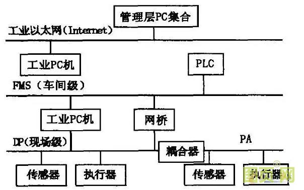 Profibus現場總線是世界上應用最廣泛的現場總線技術之一,主要由3個兼容部分組成,即Profibus-DP(Decentralized Periphery),Profibus-PA(Process Automation),Profibus-FMS(FieldbusMessage Specification),適用于工廠內車間級和現場級的設備間數字化的數據交換和通信,以實現工廠現場底層到車間級分散式數字控制和現場通信網絡化,從而為實現工廠綜合自動化和現場設備智能化提供了可行的解決方案。現場總線結構如圖所示。