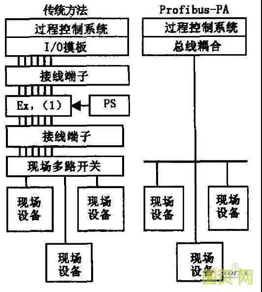 Profibus-PA是為過程自動化特別設計的,它將自動化系統和過程控制系統與壓力、溫度和液位變送器等現場設備連接起來。它可用來替代4~20mA的模擬技術。使用傳統方法與使用Prof-ibus-PA的比較如圖2所示。從現場到現場多路開關基本一致。使用傳統布線方法,每一個信號都需獨立引線至過程控制系統的I/O模板;每個設備都需單獨電源。相反,使用Profibus-PA,只需一對電纜就可以傳輸所有信息并向現場設備供電;不僅節省電纜費用,同時減少了系統I/O模板數量。