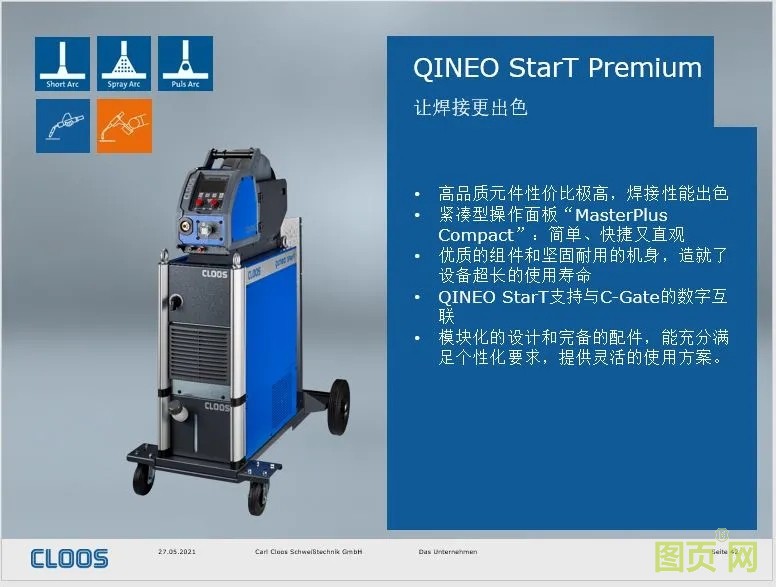QINEO StarT讓焊接更出色:這臺焊接電源將為您打開手工焊和自動(dòng)焊世界的大門。除了標(biāo)準(zhǔn)工藝之外,還能暢享最多5種克魯斯獨(dú)家焊接工藝。不必費(fèi)時(shí)費(fèi)力尋找參數(shù),就能立刻開始焊接作業(yè)。此設(shè)備支持創(chuàng)新節(jié)能的MIG/MAG短弧工藝精細(xì)控制( Fine Weld)。由于飛濺極低,特別適合用來焊接薄板、涂層板材以及可見的精細(xì)焊縫。多種可選組件和功能讓QINEO StarT成為您專屬的焊接電源——完全按照您的自動(dòng)化焊接任務(wù)需求定制。