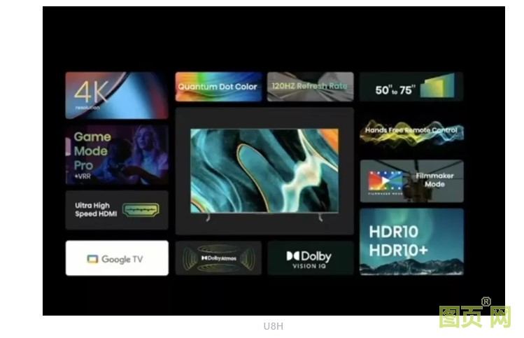 另一款Mini LED產品U8H,包含55/65/75英寸三個尺寸,擁有4K分辨率,120Hz刷新率,亮度可達1500nits,產品將在2022年第二季度中期上市,售價1099美元起。