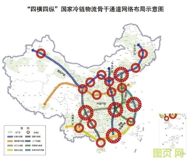 “四橫”是指北部、魯陜藏、長江、南部四大通道;“四縱”則是西部、二廣、京鄂閩、東部沿海四大通道。我國將通過“四橫四縱”串接農產品主產區和19個城市群,形成內外聯通的國家冷鏈物流骨干通道網絡。除了骨干通道外,我國還將打造冷鏈物流運行體系,加強產銷冷鏈集配中心建設,構建服務國內產銷、國際進出口的兩大冷鏈物流系統,推進干支線物流和兩端配送協同運作,建設國內國際一體化冷鏈物流網絡。同時,我國還將建立一批產銷冷鏈集配中心。在產地,建設一批產地冷鏈集配中心,推廣“移動冷庫+集配中心(物流園區)”等新模式,提高產地冷鏈設施利用效率和農產品產后商品化處理水平。在城市,建設一批銷地冷鏈集配中心,集成整合流通加工、區域分撥、城市配送等功能,密切與存量冷鏈設施業務聯系,引導存量冷鏈設施資源集中,優化城市冷鏈設施布局。通過產銷冷鏈集配中心建設,形成“分散”到“集中”再到“分散”的冷鏈物流組織模式,有效擴大冷鏈物流服務網絡覆蓋面。