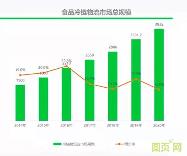 2019年,我國冷鏈物流市場規模為3391.2億元,比上年增長505.2億元,同比增幅17.5%。2020年我國冷鏈物流市場總規模為3832億元,比2019年增長440.8億元,同比增長13%,并且仍保持增長態勢。