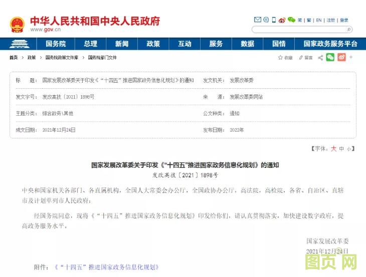 為統籌推進“十四五”期間國家政務信息化工作,指導各地方有序開展政務信息化建設,國家發改委制定并印發了《“十四五”推進國家政務信息化規劃》。