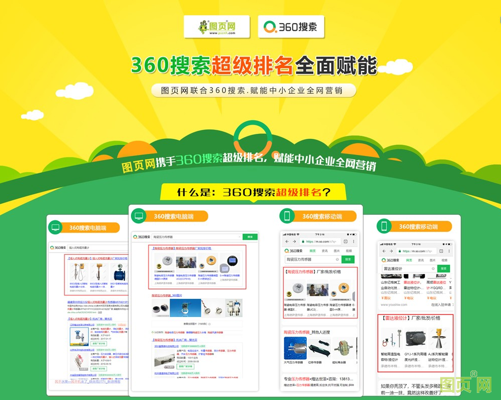 圖頁網賦能中小企業網絡營銷推廣,從上傳產品到上線展現,我們一對一服務,花一個員工工資,為您在360首頁推廣一年,全天全國獨霸流量,一個關鍵詞只做一家企業,先到先得,趕快聯系我們吧!