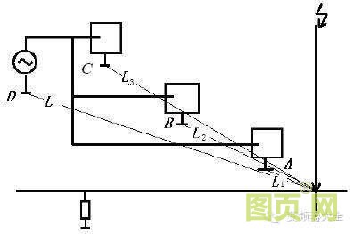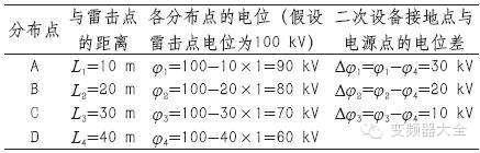 三個設備外殼電位分別為:φ(A,B,C)=IR-L(1,2,3)ε;而電源的電位為:φD=IR-L4ε;設備外殼與電源電位差為:Δφ=φ(A,B,C)-φD。其中ε為電壓降常數1kV/m。