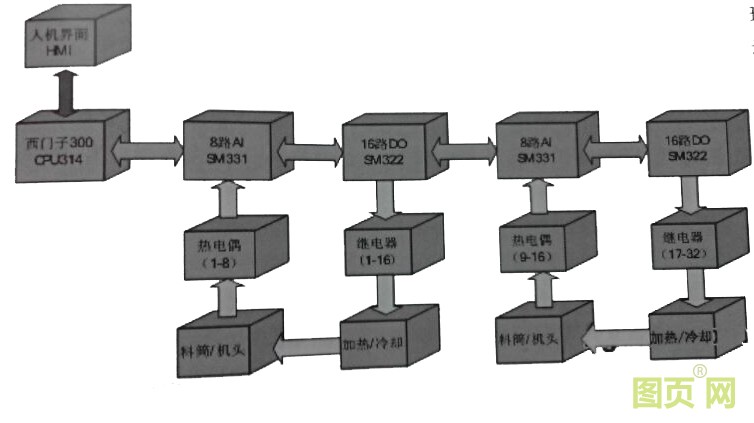 傳統的控制方式有離散式溫控儀表控制和PLC集中控制兩種,第一種方式不具備集中控制的意義,故不作分析。以西門子S7-300的PLC構成16個溫區的集中控制系統硬件配置如圖所示。