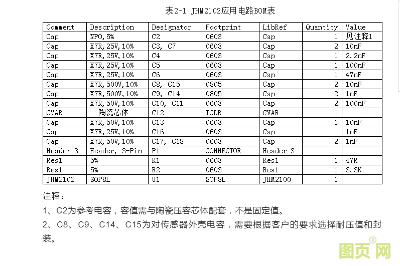 JHM2102是一款針對陶瓷電容傳感器設計的信號調理電路。它所適用的陶瓷電容傳感器一般具有可變電容CVAR和參考電容CREF兩個電容,其中CVAR隨外部壓力的變化而變化,而CREF電容基本不隨壓力變化而變化。JHM2102充分利用這兩個電容的特點,測量兩者的比值,并經過一系列的信號調理產生出與壓力變化成比例的電壓信號輸出。