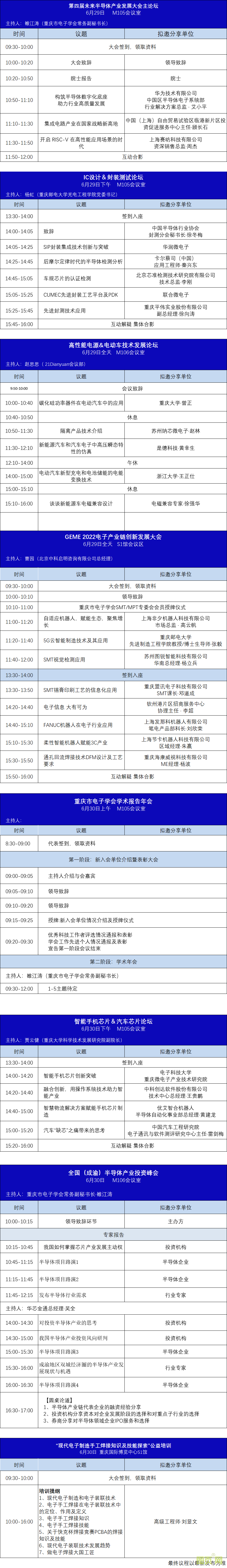 同期將舉辦由重慶經開區?Qualcomm中國?中科創達聯合創新中心聯合主辦的第四屆未來半導體產業發展大會,GEME 2022電子產業鏈創新發展大會,由重慶市半導體行業協會與成都電子信息產業生態圈聯盟聯合主辦的成渝地區電子信息產業協同發展研討會。會議聚焦產業熱點痛點,打造產學研用一體深度互動平臺,構建產業生態交流長效機制。