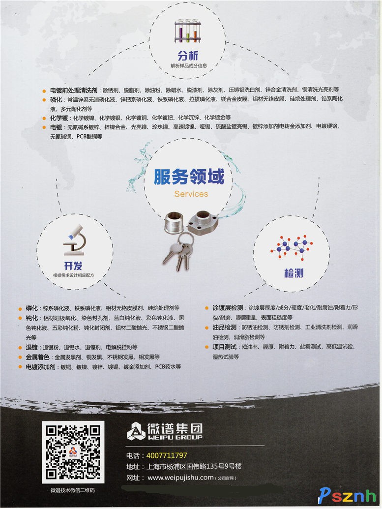 微譜技術的業務范圍幾乎覆蓋所有化工材料行業,在眾多領域積累了成功的技術服務經驗:塑料、橡膠、橡塑用助劑、膠粘劑、涂料、油墨、工業清洗劑、民用清洗劑、金屬表面處理劑、金屬加工液、水處理助劑、建筑類添加劑、油田助劑、皮革助劑、紡織印染助劑、脫模劑、助焊劑、潤版液、選礦藥劑等幾十個品類。截止2017年,微譜技術已經累計為包括世界500強企業在內的30000多家企業提供相關分析技術服務。
