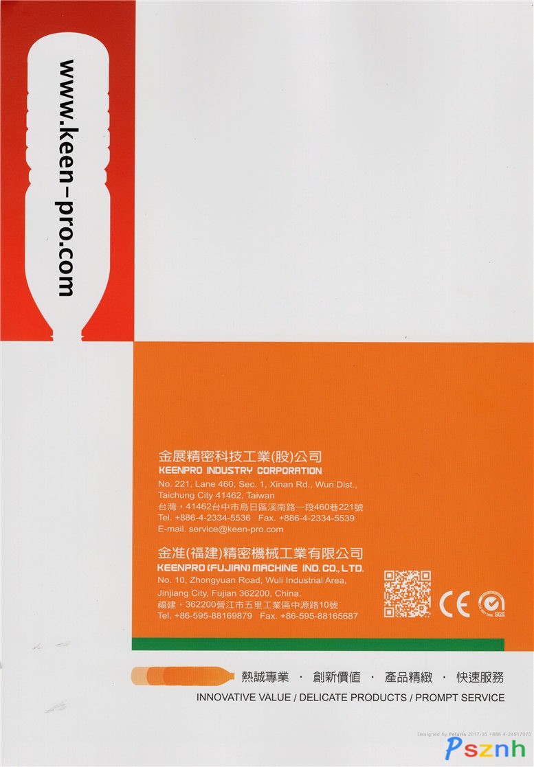 金展機械,是一家臺資企業(yè),其研發(fā)團(tuán)隊設(shè)立于臺灣總部(金展精密科技工業(yè)股份有限公司),制造工廠位于臺灣烏日區(qū)及大陸福建省(金準(zhǔn)精密機械工業(yè)有限公司),以「熱誠」和「專業(yè)」的理念發(fā)展「KEENPRO」自我品牌,致力于PET全自動吹瓶設(shè)備的研發(fā)、生產(chǎn)、銷售及服務(wù)等業(yè)務(wù),秉持著「創(chuàng)新價值、產(chǎn)品精致、快速服務(wù)」的精神,為客戶創(chuàng)造最大的價值。