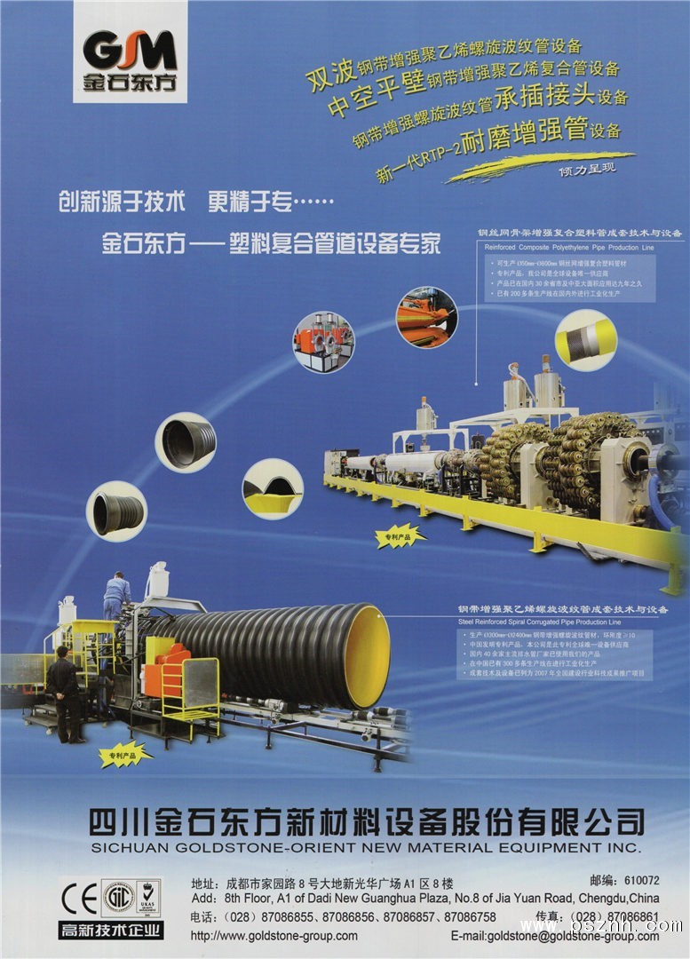 四川金石東方新材料設備股份有限公司致力于鋼增強塑料復合管道、真空鍍膜技術的研發和應用,為客戶提供鋼增強塑料復合管、真空鍍膜全套生產工藝、技術解決方案及成套生產設備。公司集方案設計、產品制造、生產銷售、安裝調試、售后服務五位為一體。目前是中國高新技術企業、四川省企業技術中心、中國塑料加工工業協會塑料管道專委會理事單位、《特種結構》理事單位。榮獲建設部科技促進中心和中國化學建材協調組-塑料管道專家組共同頒發的“突出貢獻”獎。