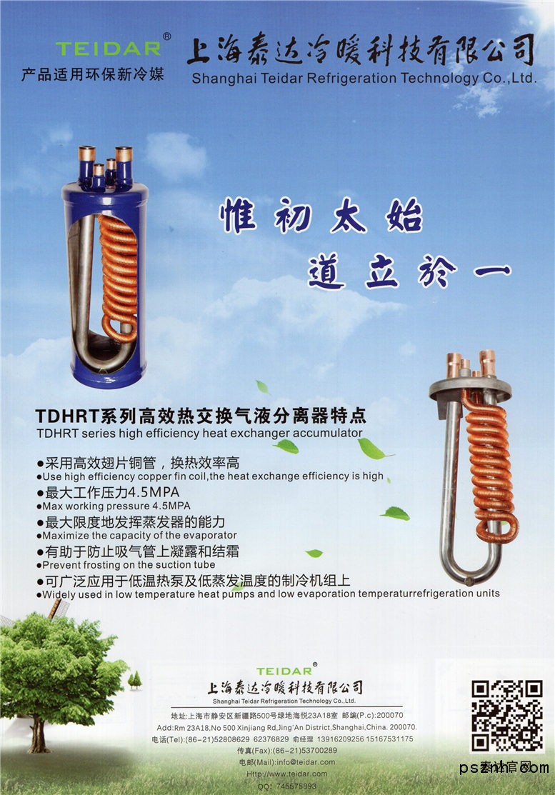 上海泰達冷暖科技有限公司專注于高品質制冷與空調系統零部件的研發、制造及銷售業務。擁有自主進出口權,品牌:TEIDAR,浙江生產基地通過ISO9001:2008管理體系認證和獲得小型壓力容器生產許可證。憑借十多年的從業經驗,先進的制造設備和嚴格的質量控制管理體系,我們的產品具有環保、高效可靠、規格齊全、易安裝使用等特點,廣泛應用于壓縮機保護裝置和油路管理控制系統,主要包括:過濾器(干燥過濾器、吸氣過濾器)、油路管理控制系統(油位控制器、油分離器、儲油器、油壓差單向閥、油過濾器)、閥(球閥、單向閥、截止閥、卸荷閥、節流閥、引射器)、電磁閥(三通熱回收電磁閥、三通熱氣除霜閥、常閉膜片/活塞電磁閥、卸載電磁閥)、壓力容器(氣液分離器、儲液器、熱交換器)、其他保護裝置(視液鏡、減震管、壓力表)、黃銅及紫銅接頭、管組件。