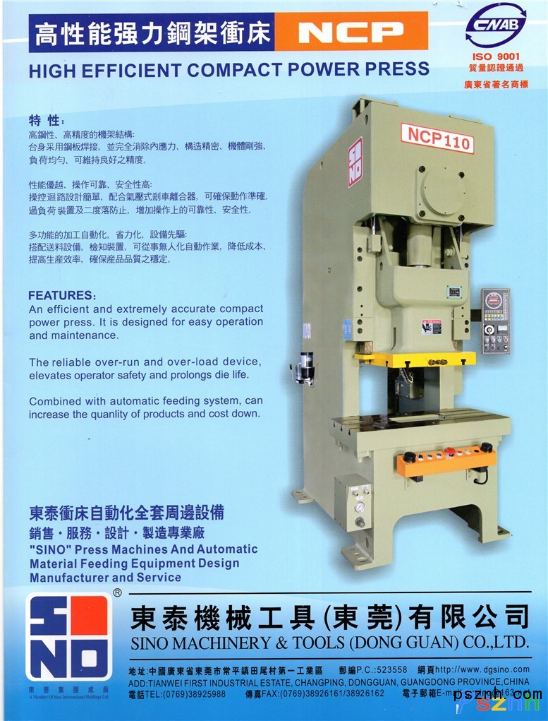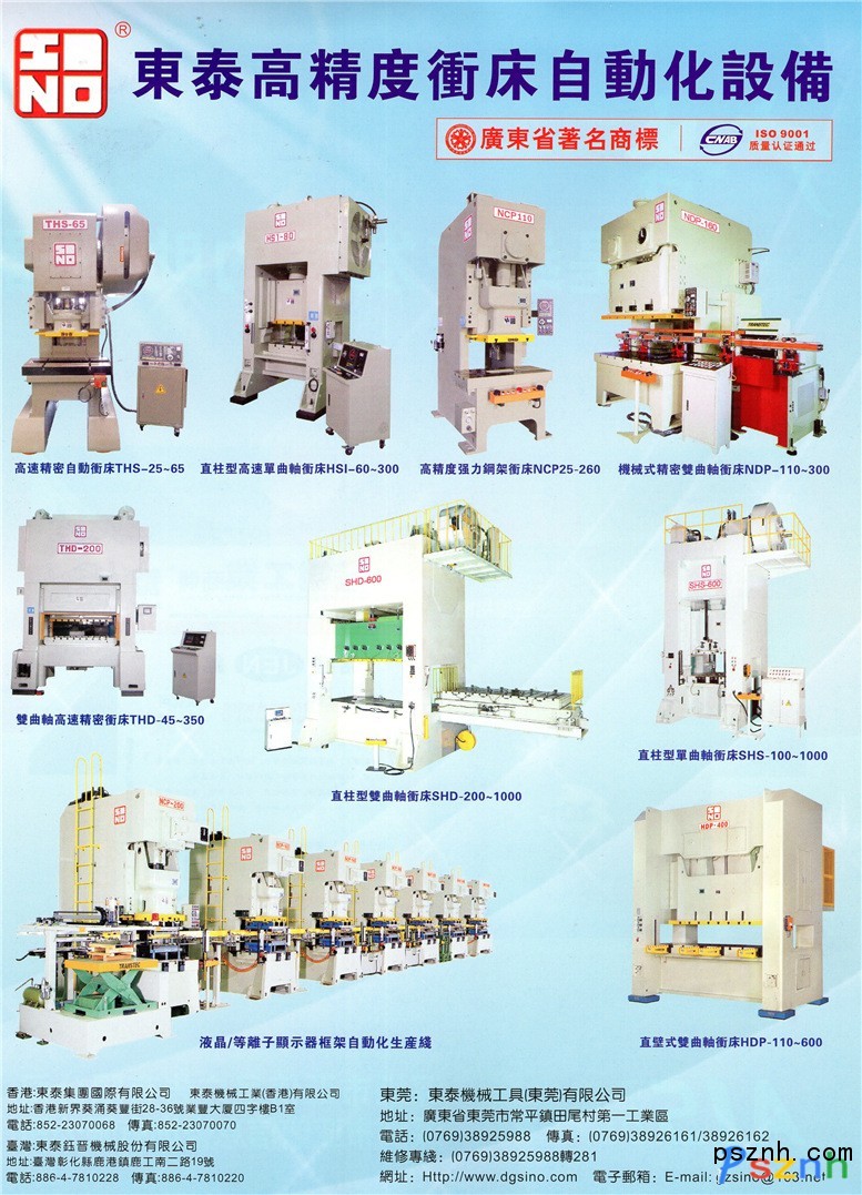 東泰機(jī)械工具(東莞)有限公司是香港東泰集團(tuán)國際有限公司控股子公司。為配合工業(yè)快速的發(fā)展同時滿足客戶經(jīng)營成本、提高生產(chǎn)效率、品質(zhì)及加強(qiáng)競爭力的需求,本公司積極研究發(fā)展,集設(shè)計(jì)、制造、銷售、服務(wù)于一體,專業(yè)提供高速精密自動沖床、電子數(shù)控送料機(jī)、機(jī)械手設(shè)備、自動化周邊設(shè)備及各類型標(biāo)準(zhǔn)五金模具零件,產(chǎn)品廣泛應(yīng)用于汽車工業(yè)、電子產(chǎn)品、家用電器、玩具、五金零件加工等行業(yè)。