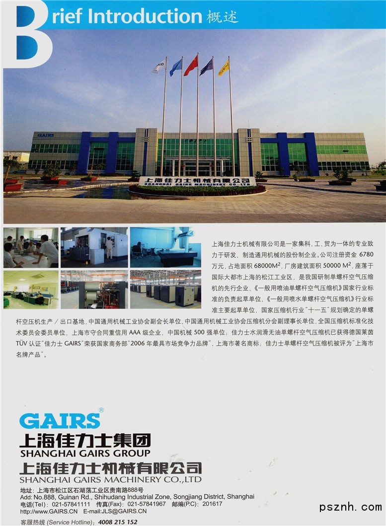 上海佳力士機械有限公司是一家集科、工、貿為一體的專業致力于研發、制造通用機械的股份制企業。公司注冊資金 6780萬元,占地面積68000M²,廠房建筑面積50000 M²,座落于國際大都市上海松江工業區,是我國研制單螺桿空氣壓縮機的先行企業、《一般用噴油單螺桿空氣壓縮機》國家行業標準的負責起草單位、《一般用噴水單螺桿空氣壓縮機》行業標準主要起草單位,國家壓縮機行業“十一五”規劃確定的單螺桿空壓機生產/出口基地,中國通用機械工業協會副會長單位、中國通用機械工業協會壓縮機分會副理事長單位,全國壓縮機標準化技術委員會委員單位,全國守合同重信用企業,中國機械500強單位;“佳力士GAIRS”榮獲國家商務部“2006年最具市場競爭力品牌”、上海市著名商標;佳力士單螺桿空氣壓縮機榮獲上海市名牌產品;佳力士水潤滑無油單螺桿空氣壓縮機獲得德國萊茵TÜV認證。