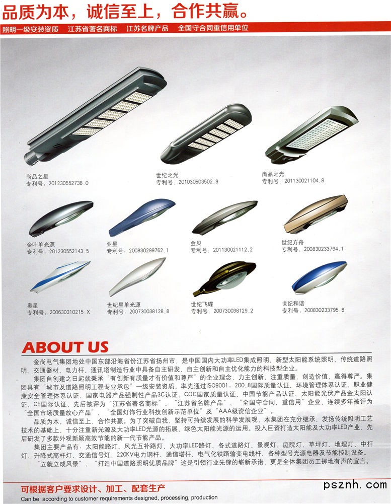 金尚電氣集團地處中國東部沿海省份江蘇省揚州市,是中國國內大功率 LED集成照明、新型太陽能系統(tǒng)照明、傳統(tǒng)道路照明、交通器材、電力桿、通訊塔制造行業(yè)中具備自主研發(fā),自主創(chuàng)新和自主優(yōu)化能力的科技型企業(yè)。投資一億五千萬元,下設揚州金源燈飾有限公司、揚州市遠景照明有限公司、揚州金源市政工程有限公司、揚州金源照明設計有限公司、江蘇尚品交通器材有限公司、江蘇尚品光電有限公司共六家分公司。 集團自創(chuàng)建之日起就秉承“有創(chuàng)新有質量才有價值和尊嚴”的企業(yè)理念,力主創(chuàng)新,注重質量,創(chuàng)造價值,贏得尊嚴。多年來,一直致力于新能源新材料和新光源的開發(fā)研制,不斷吸收國內外同行的先進制造技術,加工工藝和管理理念。憑借雄厚的資金實力,完備的生產能力,一流的研發(fā)團隊,精益求精的售后服務機制贏得了廣大客商的信賴。產品遍銷中國國內,遠銷俄羅斯、中東、歐美等地區(qū)。 集團具有“城市及道路照明工程專業(yè)承包”一級安裝資質,率先通過 ISO9001:2008國際質量認證、環(huán)境管理體系認證、職業(yè)健康安全管理體系認證、國家電器產品強制性產品3C認證、CQC國家質量認證、中國節(jié)能產品認證、太陽能光伏產品金太陽認證、CE國際認證、先后被評為“江蘇省著名商標”、“江蘇省產品”、“全國守合同、重信用”企業(yè),連續(xù)多年被評為“全國市場質量放心產品”、“全國燈飾行業(yè)科技創(chuàng)新示范單位”及“AAA級資信企業(yè)”。 經過多年的高速發(fā)展,集團現(xiàn)已成為集開發(fā)、設計、制造和安裝為一體的專業(yè)化、規(guī)模化的制造商。占地面積達 60000平方米,擁有技術員工 300余人。擁有多套雙聯(lián)數(shù)控大型折彎機,數(shù)控注塑機,大型燈具壓鑄機,液壓拉伸機及粉末靜電噴涂流水線,大功率 LED生產流水線,LED光、色、電檢測設備等先進設備。 品質為本,誠信至上,合作共贏。為了突破自我,堅持可持續(xù)發(fā)展的科學發(fā)展觀,本集團在充分繼承、發(fā)揚傳統(tǒng)照明工藝技術的基礎上,十分注重新光源及大功率 LED光源的拓展,綠色太陽能光源的運用。投入巨資打造太陽能及大功率 LED產業(yè),先后研發(fā)了多款外觀新穎高效節(jié)能的新一代節(jié)能產品。 集團主要產品有:太陽能路燈、風光互補路燈、大功率 LED路燈、各式道路燈、景觀燈、庭院燈、草坪燈、地埋燈、中桿燈、升降式高桿燈、交通信號燈、220KV電力鋼桿、通信塔桿、電氣化鐵路輸變電線桿、各種型號光源電器及節(jié)能控制設備。滿足需要,提供零缺陷產品”。金尚集團在全國各地與各級黨政機關、照明專家、承建商和各級營銷商都有著廣泛深入的合作,在提供優(yōu)質領先產品的同時,也為顧客提供一流的照明設計方案和科學的設計理念。設計和制造過程強調品質標準的同一性,器件結構的完整性,造型地域文化的多樣性,亮化與美化的藝術性。曾先后參與多項國內外大型亮化工程的建設。