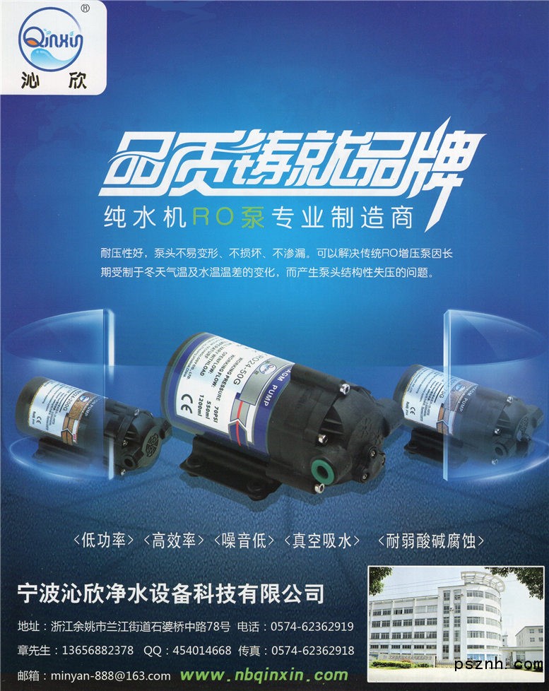 寧波沁欣凈水設備科技有限公司是一家集研發,生產、銷售于一體的科技型企業,公司占地面積達15000平方米,廠房8500平方米,擁有多名技術研發工程師,公司充分發揮在技術創新,產品研發和生產制造等方面的優勢,擁有先進的生產設備和嚴格的質量管理體系,有多余生產電機產線,專業生產RO增壓泵,純水機、商用機、超濾機、配件加工等產品,用專注態度成就專業品質。公司本著“精心管理”不斷創新、科技領先、共享成功、經營理念、把市場領先、技術領先、管理領先、作為主要目標、力爭做到,高標準、高質量為奮力打拼,創造價值,服務客戶。