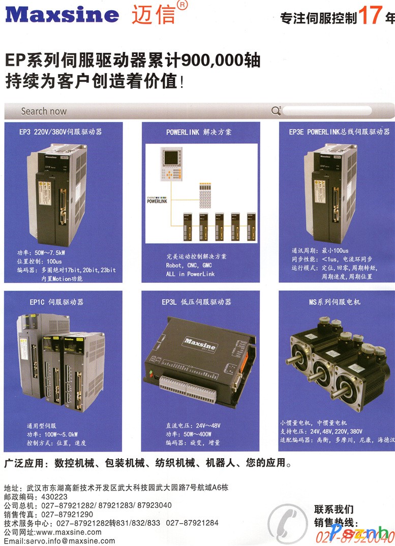 邁信電氣成立11年來,不斷加大自主研發力度,目前已擁有多項自主知識產權,在伺服技術領域處于國內同行業領先地位。研制的全數字式交流伺服驅動器和永磁交流伺服電機為公司核心產品,已廣泛應用于數控機床、包裝機械、紡織機械、機器人、激光加工及自動化生產線等眾多自動化領域,產品遠銷臺灣、東南亞、印度、南非、俄羅斯、巴西等國家。