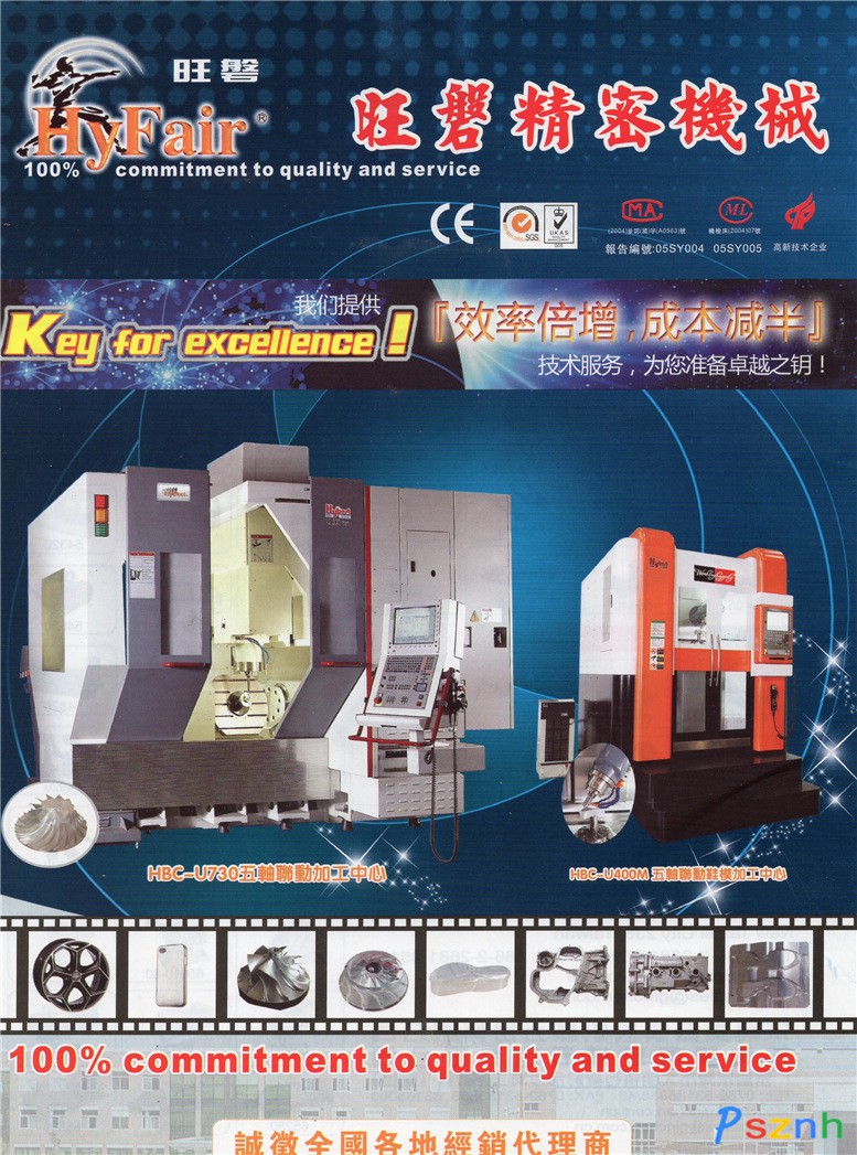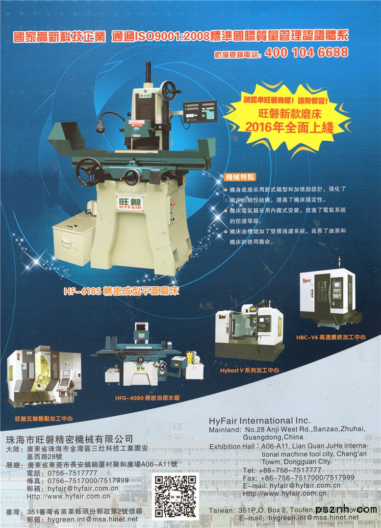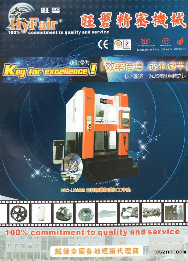 珠海市旺磐精密機械有限公司的“HYFAIR磨床”和“HYBEST加工中心”目前是國內的知名品牌產品,產品遠銷歐美、東南亞及國內各地。HYFAIR系列精密手動磨床已經連續十年全國產銷量第一,HYBEST加工中心系列產品也已經成功進入航空航天、汽車零部件制造、精密醫療器械、3C產品行業及電子商務領域。于2009年11月獲得高新技術企業證書。公司的“HYFAIR磨床”和“HYBEST加工中心”共擁有3項外觀設計專利及13項實用型設計專利;“HYBEST五軸聯動加工中心”共有2項外觀專利、2項發明專利及10項實用新型專利(正在申請中)。于2005年9月獲得ISO9001:2008管理認證證書