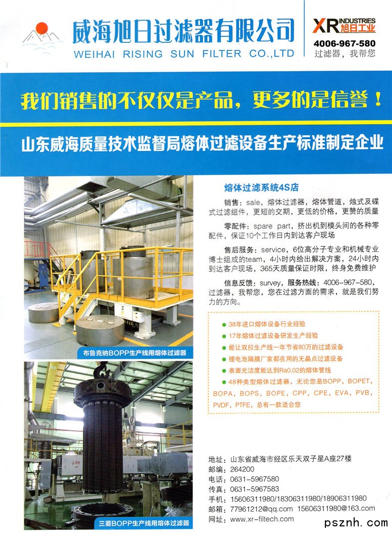 威海旭日過濾器有限公司生產的薄膜熔體過濾器,至今最大使用壓力45Mpa,最大內徑500mm,無滯留死角,無泄漏;熔腔內裝濾芯數,可從1支到48支,過濾面積從0.3m2到30m2;熔體管道可按照生產現場需求加工成各種角度和規格,以滿足生產線的合理布局,內表面光潔度均達到Ra0.02,處于國內先進水平;在加熱方式上,有普通電瓦(陶瓷,鑄鋁)加熱,夾套式介質加熱,紅外加熱,電磁加熱等方式;我公司同時也提供各種結構形式的濾芯,密封件及排料排氣閥,以及與過濾設備相配套的輔助設備如煅燒,清洗,預熱等設備,且均可單獨供貨,按客戶需要訂制。