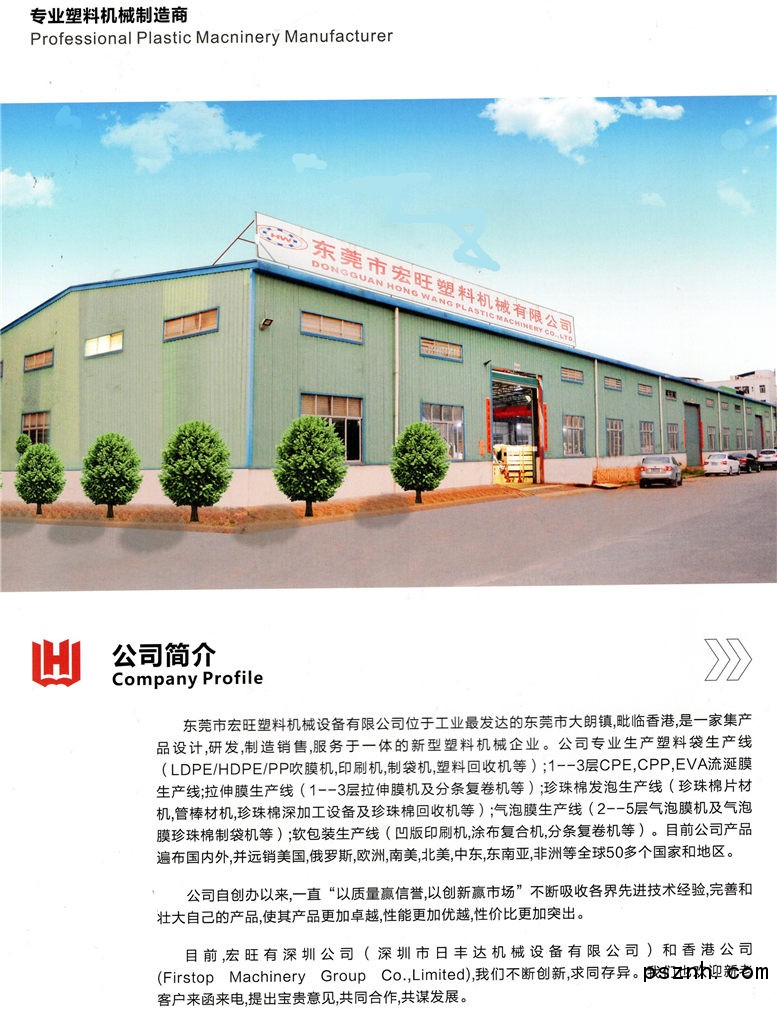 東莞市宏旺塑料有限公司成立于1999年,是廣東省著名的塑料設備生產(chǎn)制造公司。公司致力于新技術的研發(fā),并將研究成果轉化為產(chǎn)品和生產(chǎn)力,在成套塑料制袋設備生產(chǎn)線等方面獨樹一幟,引領行業(yè)發(fā)展趨勢。