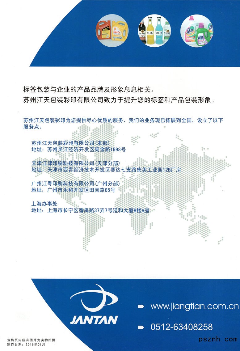 蘇州江天包裝彩印有限公司從事標(biāo)簽及紙包裝印刷,創(chuàng)業(yè)25年來(lái)公司業(yè)務(wù)及生產(chǎn)規(guī)模持續(xù)擴(kuò)大,印刷設(shè)備與時(shí)俱進(jìn),管理體系不斷提升,創(chuàng)造了很多行業(yè)第一,現(xiàn)已成為國(guó)內(nèi)的標(biāo)簽印刷領(lǐng)導(dǎo)者。江天現(xiàn)服務(wù)聯(lián)合利華、輝瑞制藥、億滋食品(原卡夫)、道達(dá)爾、百加得、花王、漢高、雅思蘭黛、高露潔、上海家化、百雀羚、白貓、娃哈哈、農(nóng)夫山泉、古越龍山、勁酒、統(tǒng)一食品等各行業(yè)領(lǐng)導(dǎo)企業(yè)。2011年公司整體遷入占地面積40畝的吳江經(jīng)濟(jì)技術(shù)開(kāi)發(fā)區(qū)龐金路新廠區(qū),陸續(xù)有多臺(tái)具有國(guó)際先進(jìn)水平的生產(chǎn)線投入使用。江天具有國(guó)內(nèi)領(lǐng)先的標(biāo)簽工藝技術(shù),精專的標(biāo)簽研發(fā)能力,同時(shí)具有多項(xiàng)專利,公司的技術(shù)中心被蘇州市政府認(rèn)定為市級(jí)企業(yè)技術(shù)中心,同時(shí)公司被評(píng)江蘇省高新技術(shù)企業(yè)。公司通過(guò)ISO9001、ISO14000、BRC、FSC認(rèn)證。江天公司將以更現(xiàn)代化的平臺(tái),更好的管理和更多元化的技術(shù)組合,提供更專業(yè)的標(biāo)簽和紙包裝服務(wù)。