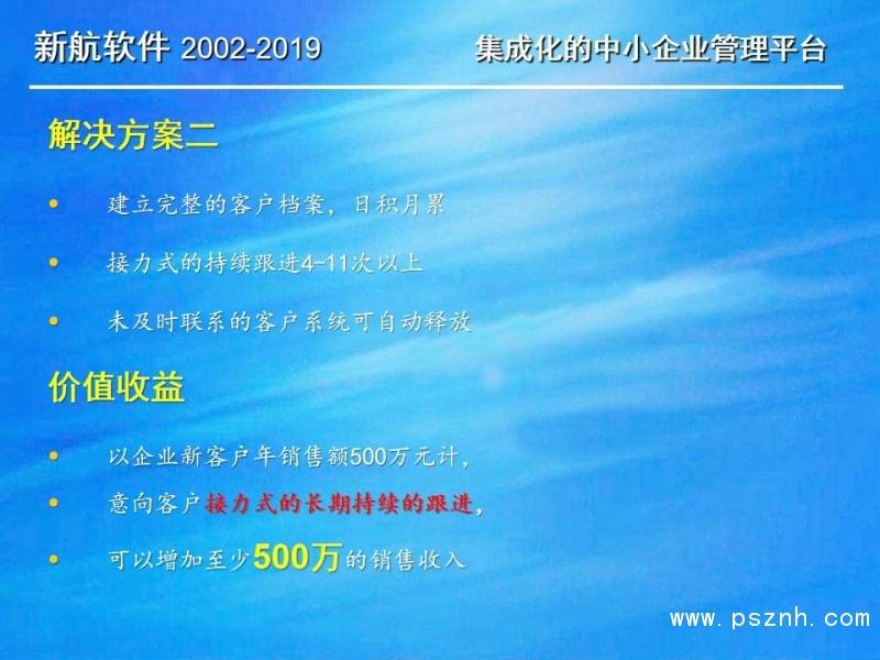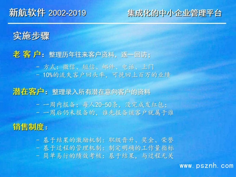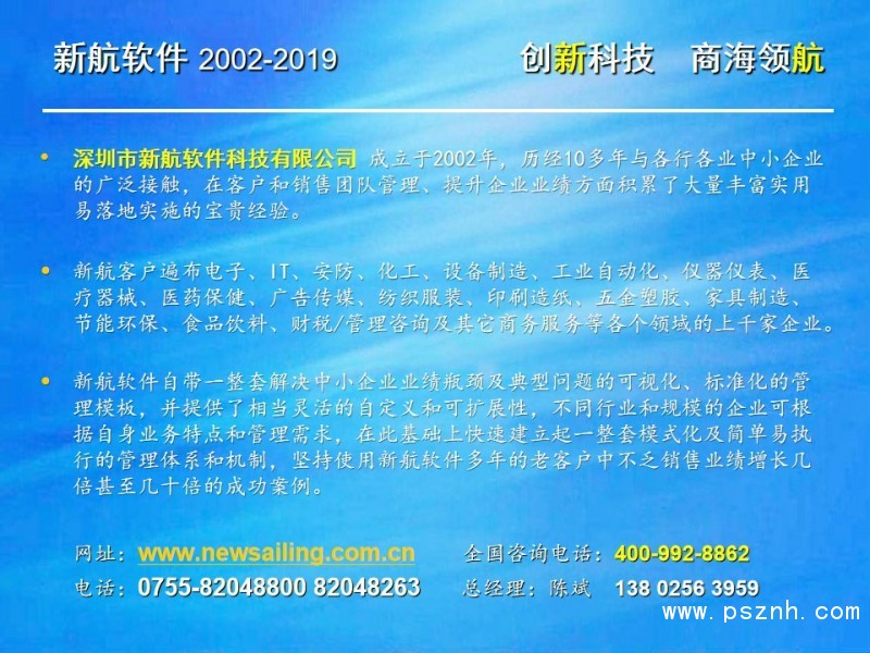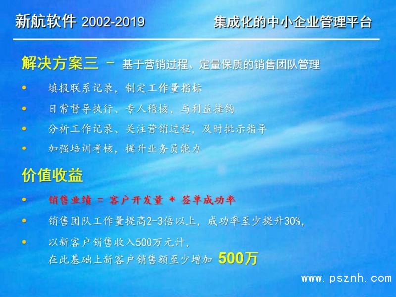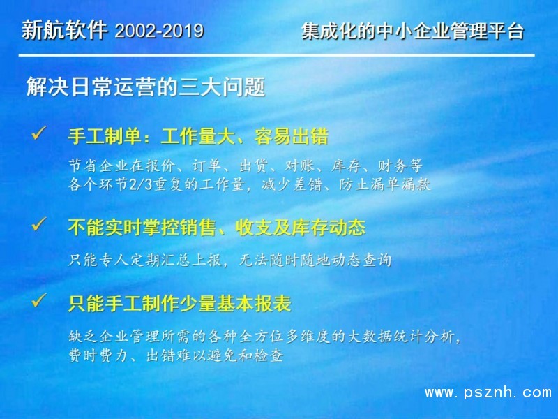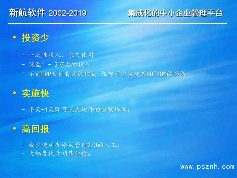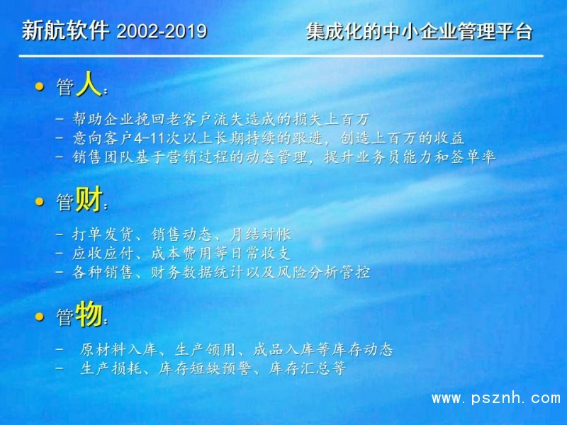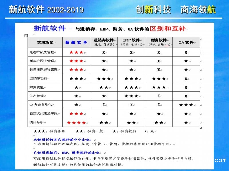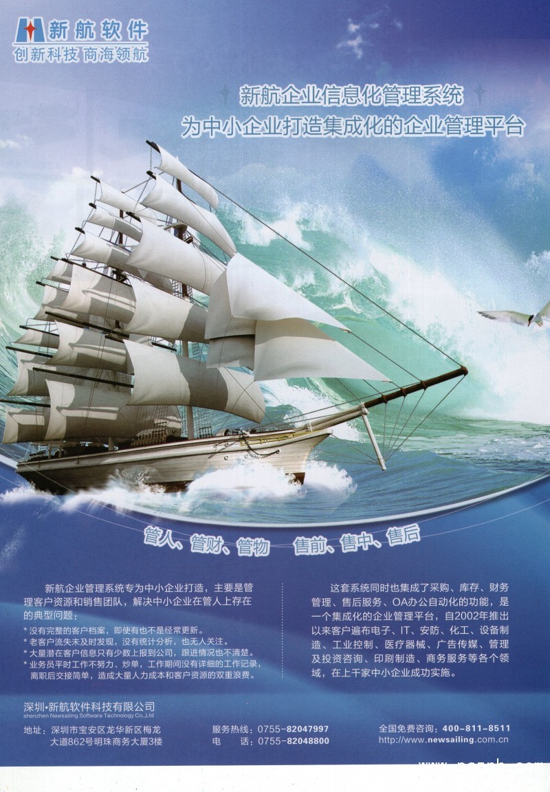 與其它管理軟件相比,新航企業信息化管理系統軟件更關注中小企業在管人、管財、管物幾個方面存在的典型問題和需求。以此為導向,新航系統提供簡單、有效、全面的信息化解決方案;新航系統內凝聚了很多實用的營銷管理理念,可以幫助企業短期內規范管理,快速建立一整套銷售部門自動化運作的管理模式。