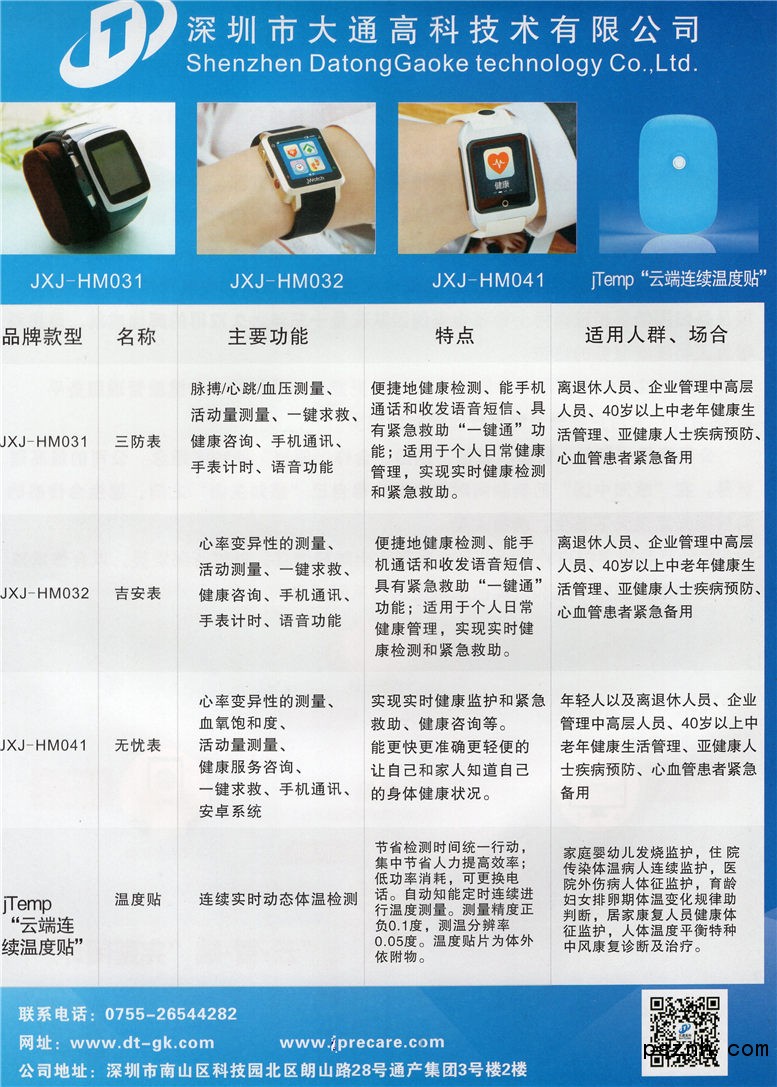 公司一直致力于研發(fā)和銷售協(xié)助老年人預防心血管保健型智能手表---Jwotch腕寶的整機和模組方案,產(chǎn)品集現(xiàn)代生命傳感技術和物聯(lián)網(wǎng)技術于一體,該項目是歸國華僑相建南博士帶領中美團隊花費十三年之久取得的輝煌成就,是用科學為人類健康服務的典范 。