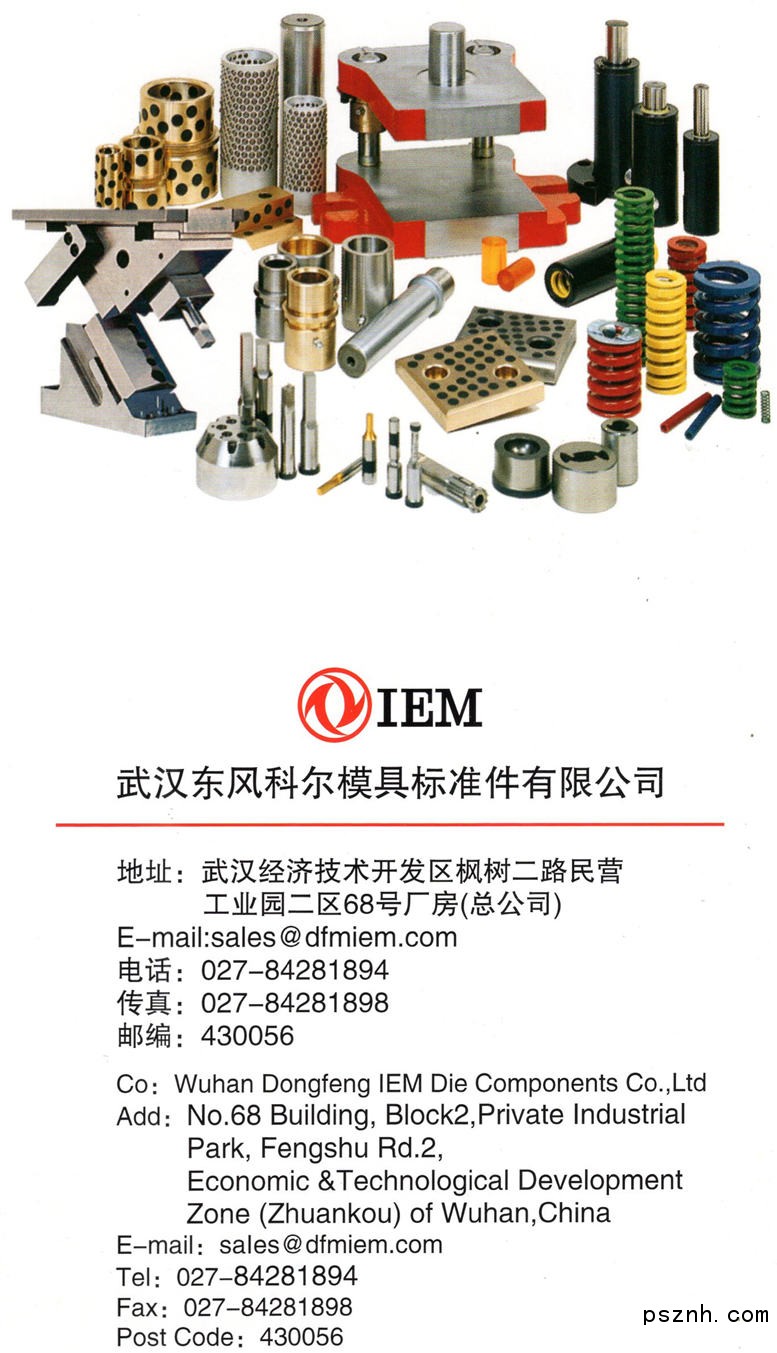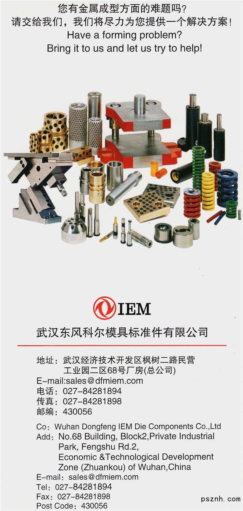 公司注冊于中國湖北省武漢經濟技術開發區高科技產業園,分設武漢、十堰兩個生產工廠,在美國、德國、意大利、日本、韓國、印度分別建立了分銷渠道,在中國設有上海、廣州、天津、重慶等銷售辦事處。產品包括斜楔、折邊機構、沖頭、凹模、固定板、導柱、導套、導板等全系列沖壓模具標準件產品,東風IEM標準涵蓋了NAAMS、VDI、JIS等行業標準,以及全球主要汽車公司的專有標準。公司以豐富的產品線,以及覆蓋全球的銷售網絡,為客戶提供方便快捷的服務。