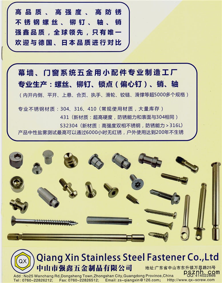 中山市強鑫五金制品有限公司主要生產“高品質、高強度、高精度、高防銹能力”的不銹鋼螺絲&緊固件、特殊螺絲、汽車緊固件、軸類零件及鋁螺絲、鋁鉚釘、鋁+不銹鋼蓋鉚釘。是全球高品質及設備齊全的不銹鋼鉆尾螺絲制造商。